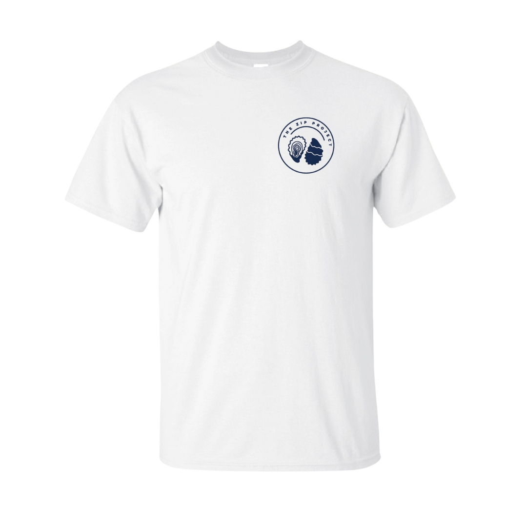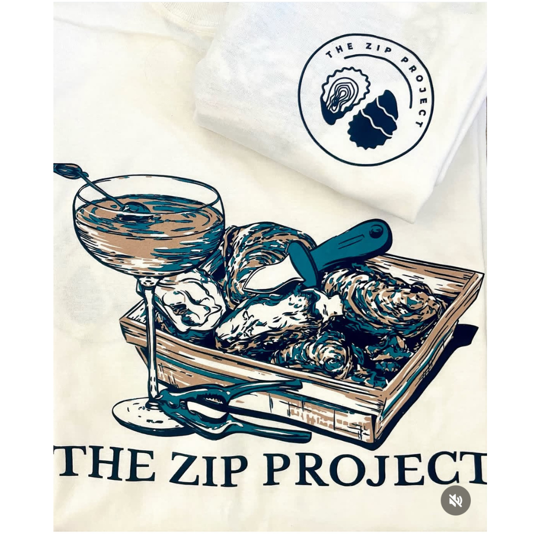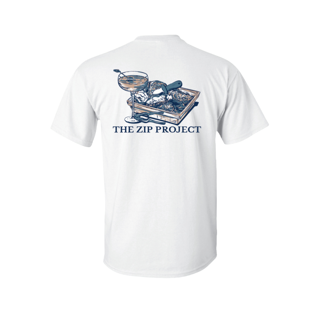 MARTINI'S AND OYSTERS Short-Sleeve T-Shirt -- Featuring the sleek Zip Project logo on the front in navy blue, and a vibrant, detailed illustration of fresh oysters and a martini on the back. Perfect for seafood and oyster lovers who want to show off their coastal vibe in style!