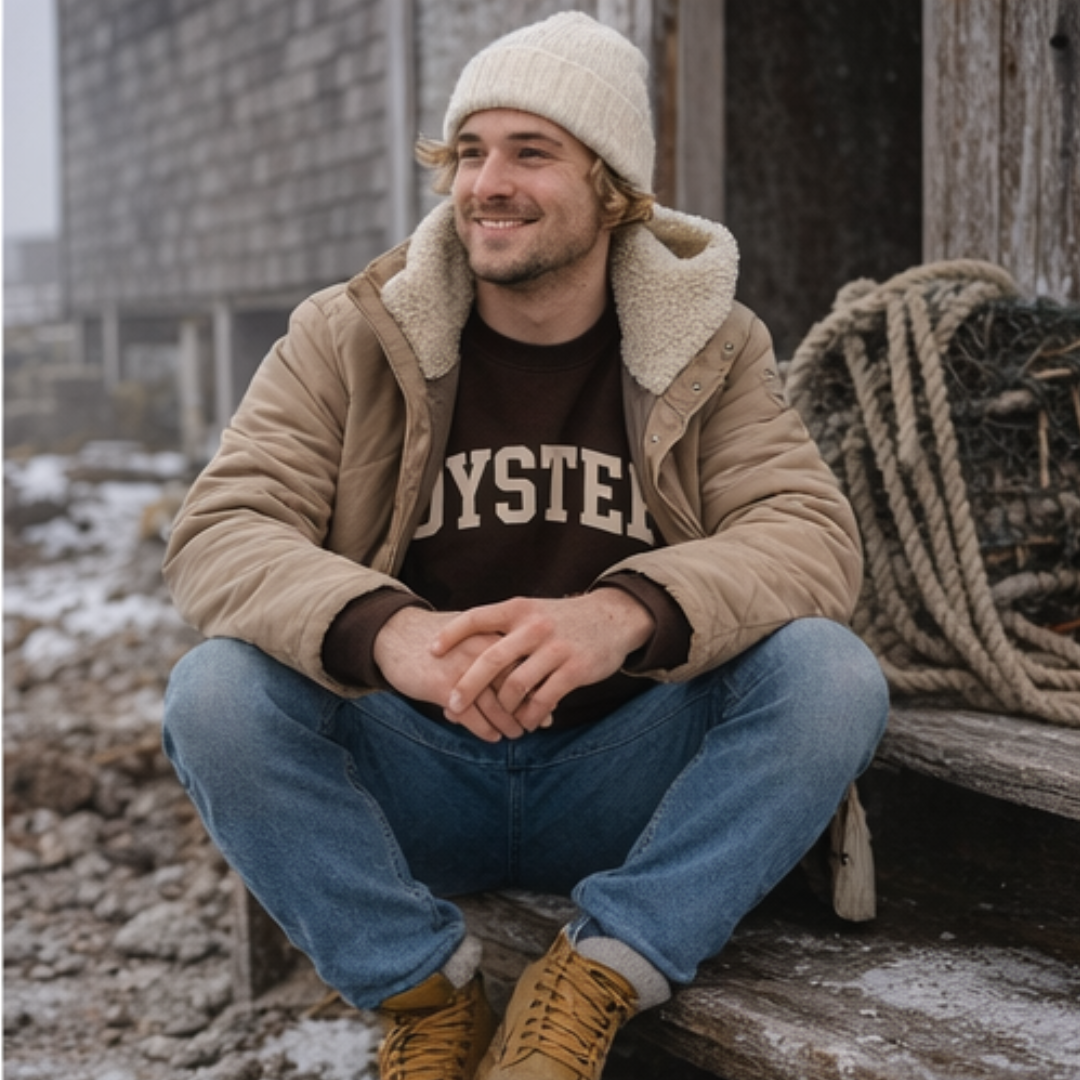 OYSTER Crewneck Sweatshirt - Featuring the word "OYSTER" written in cream, along the front of the chocolate brown crewneck sweatshirt. Perfect for oyster lovers and anyone that loves a comfy, cozy crewneck sweatshirt!